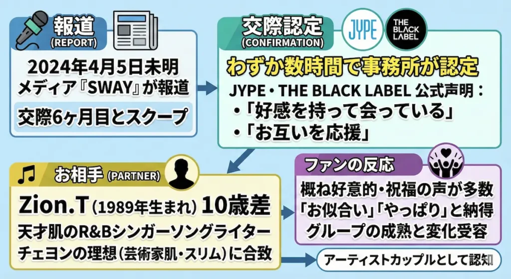 熱愛が報じられたのは2024年4月5日の未明です。新興メディアである『SWAY』が、チェヨンとZion.Tが交際6ヶ月目であるとスクープしました。