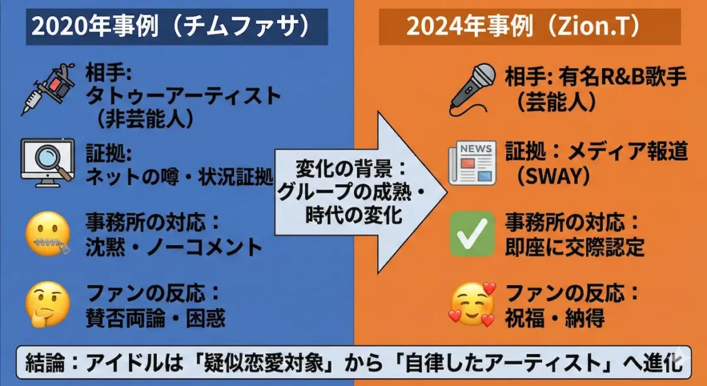 2020年と2024年の事例を比較すると、事務所の対応は180度異なります。ここには、K-POP業界の変化とグループの成長が隠されています。