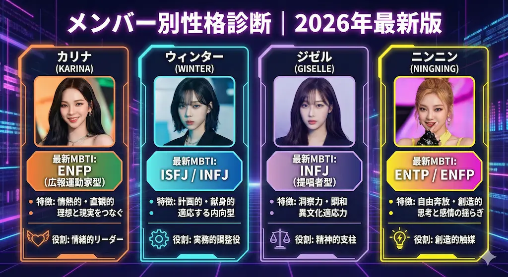 本記事では、2026年時点での最新情報に基づき、カリナ、ウィンター、ジゼル、ニンニンの性格を徹底的に分析します。ファンなら知っておきたい「見た目と性格のギャップ」や、グループとしての相性まで詳しく解説していきましょう。