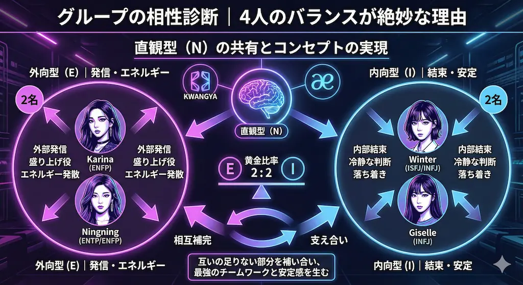 グループ内のエネルギーバランスを見ると、外向型(E)のカリナとニンニン、内向型(I)のウィンターとジゼルという「2対2」の構成になっています。この比率はチームとして活動する上で理想的です。