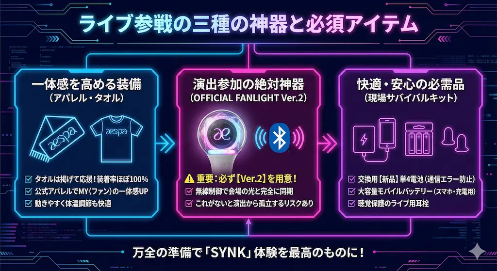 aespaのコンサートは、デジタル技術と物理的な演出が融合したエンターテインメントです。この体験を100%楽しむためには、手ぶらではなく適切なアイテムを装備して参戦する必要があります。ここでは、会場で浮かないための必須アイテムを紹介します。