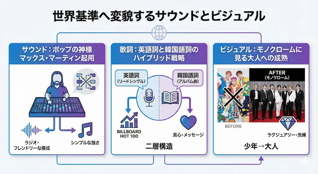 「脱K-POP」は音楽や見た目において最も顕著に表れます。これまでのBTSらしさを残しつつ、より洗練されたグローバルスタンダードへと進化を遂げています。