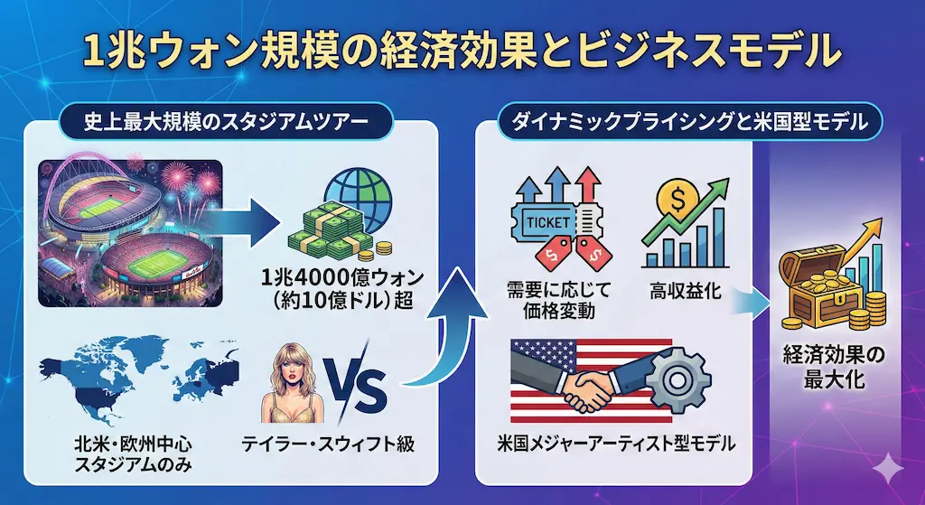 2026年のワールドツアーは、過去最大規模になると予測されます。世界中の巨大スタジアムだけを回るツアーで、その収益は1兆4000億ウォン(約10億ドル)を超えると試算されています。