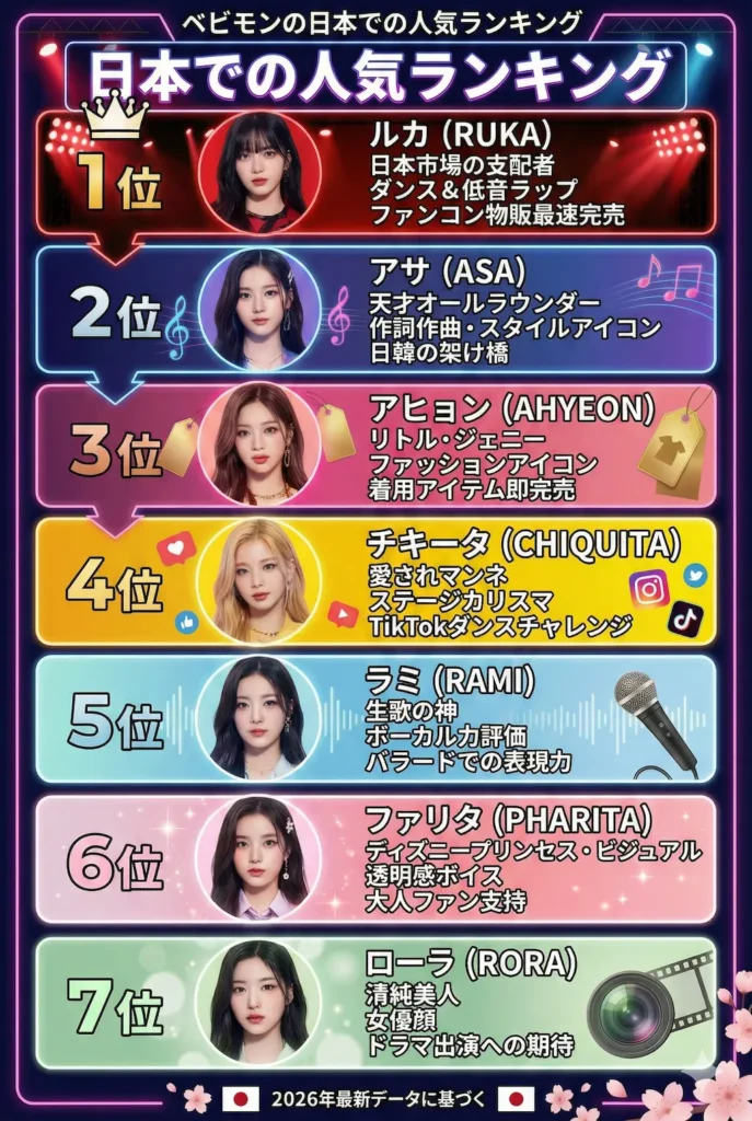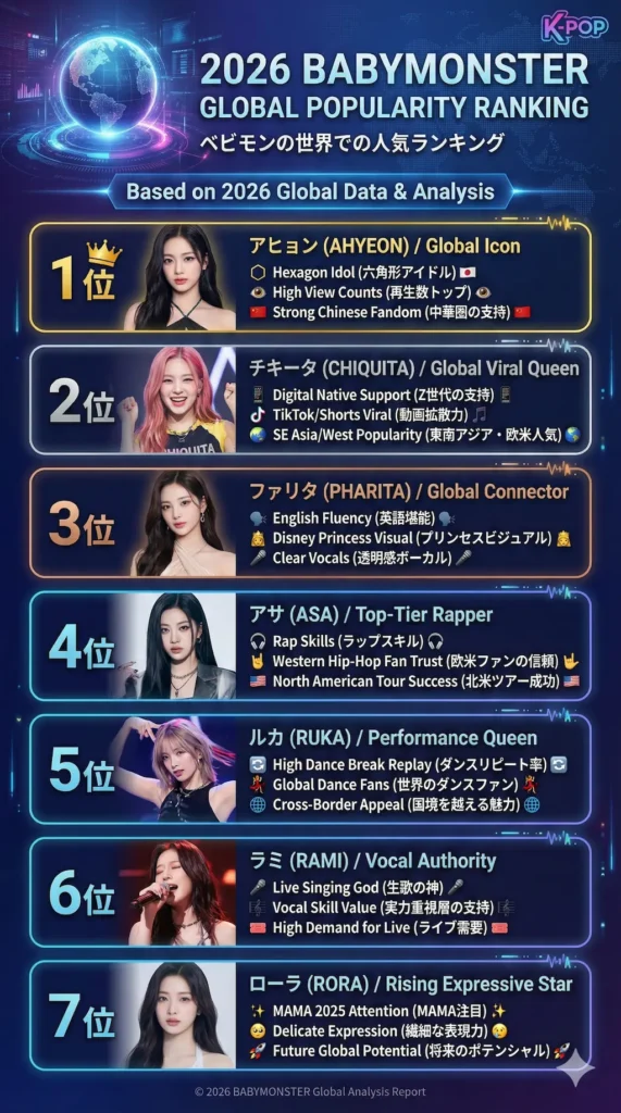 2026年のBABYMONSTERは、「7人全員がエース級」というYGエンターテインメントの戦略が結実した状態にあります。人気順位という形で序列をつけることはできますが、それは「優劣」ではなく「役割分担」の違いと言えるでしょう。