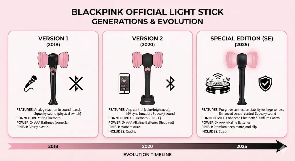 BLACKPINKのペンライトは、時代に合わせて劇的な進化を遂げてきました。グループのアイデンティティである「ハンマー型」を守りつつ、技術面で大きなアップデートを繰り返しています。
