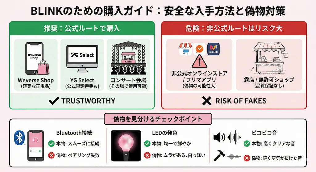 最も安全なのは「Weverse Shop」や「YG Select」などの公式ECサイトを利用することです。これらはアーティストの所属事務所が運営しているため、100パーセント本物が届きます。
