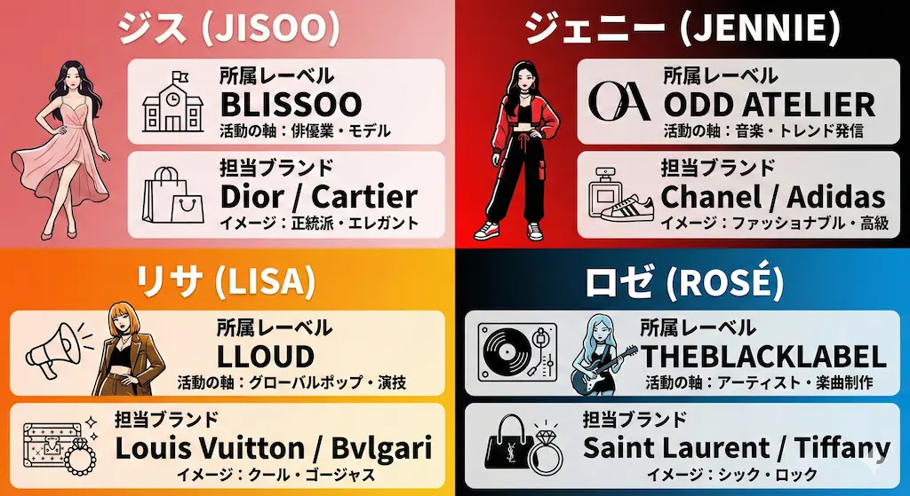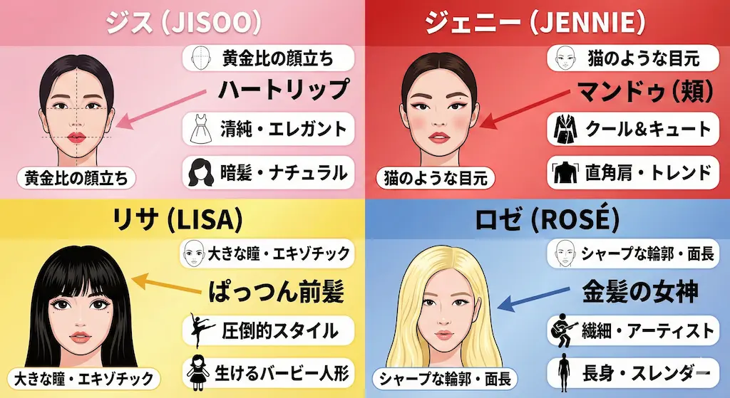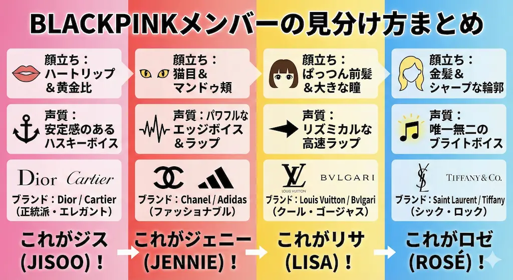 BLACKPINKの4人は、それぞれが異なる魅力を放つ唯一無二の存在です。顔立ち、声、そしてブランドという多角的な視点を持つことで、すぐに見分けがつきます。