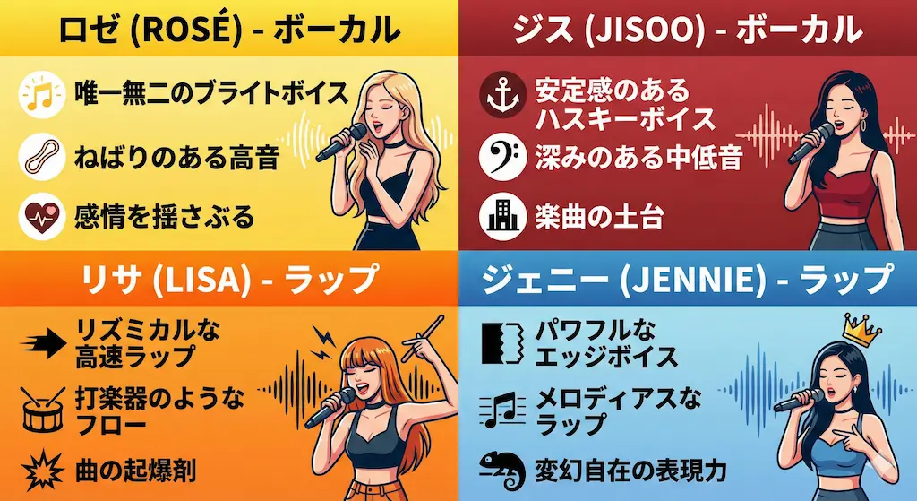 BLACKPINKの楽曲は、4人の異なる声質が重なり合うことで完成します。私が聴き分けの際に意識しているポイントを紹介します。