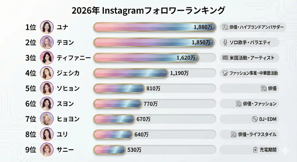 少女時代のメンバー個人のInstagramアカウントを集計した結果、女優業で世界的な成功を収めたユナと、ボーカリストとして不動の地位を築いたテヨンが2トップを形成しています。私が確認した2026年1月時点の推定フォロワー数ランキングは以下の通りです。