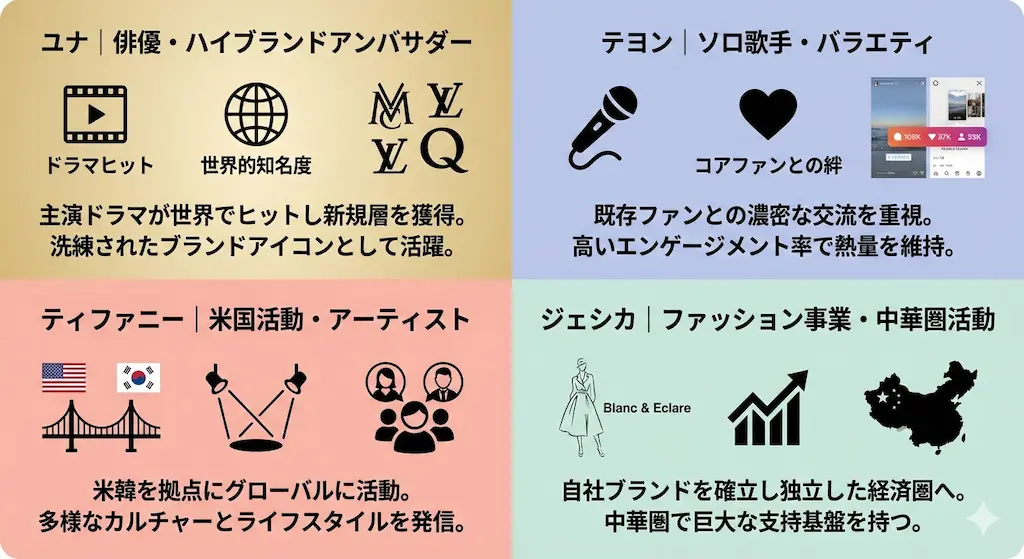 ユナの俳優業、テヨンのアーティスト活動、ジェシカのビジネスなど、それぞれが異なるターゲット層を持っています。フォロワー数の増減はありますが、それはファン層が「ただフォローする人」から「実際にコンテンツを消費する質の高いファン」へと成熟した証拠です。