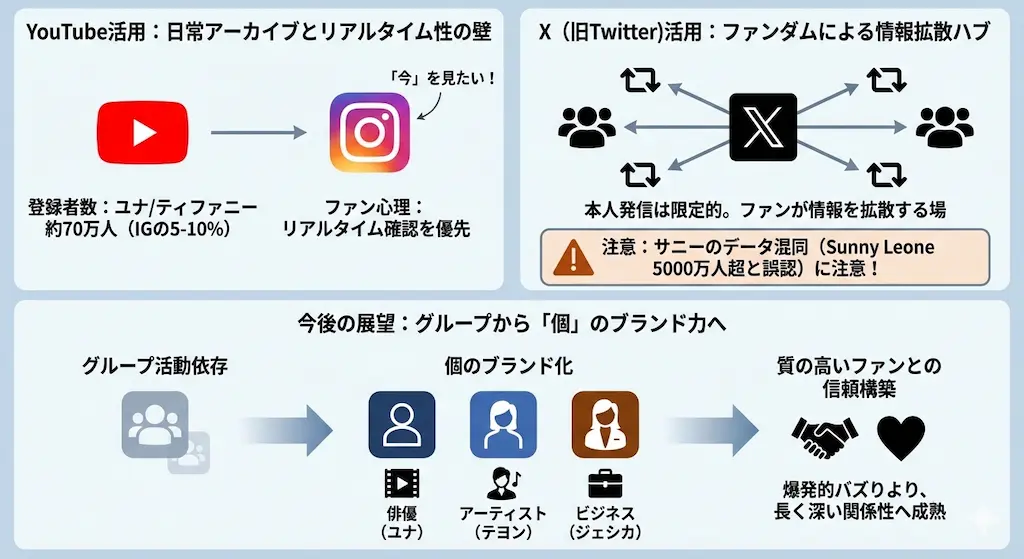 YouTubeに関しては、ユナやティファニーのチャンネル登録者数は70万人前後であり、Instagramのフォロワー数の5〜10%程度です。ファンはYouTubeで「日常」を見るよりも、Instagramで「リアルタイム」を確認することを好む傾向があります。