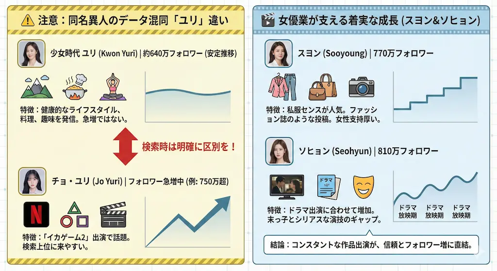 これにより、検索ランキングで「ユリ」と入力すると、チョ・ユリが上位に表示されるケースが多発しています。少女時代のユリ(Kwon Yuri)はフォロワー数約640万で、料理や登山など健康的なライフスタイルを発信しており、急増ではなく安定した推移を見せているのが特徴です。