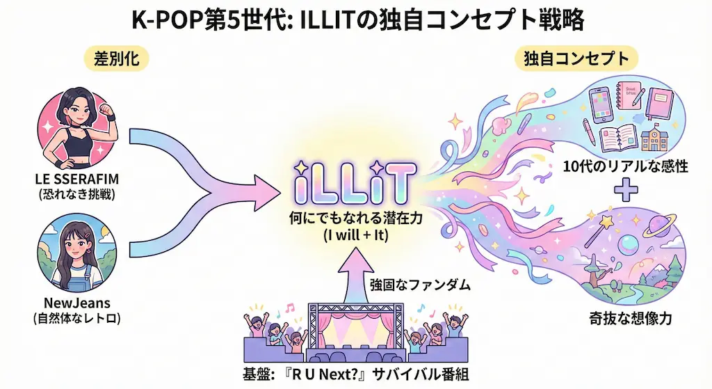 ILLITの成功は、デビュー前から始まっていたと言っても過言ではありません。彼女たちが市場でどのような位置を確立しようとしたのか、その戦略を見ていきます。
