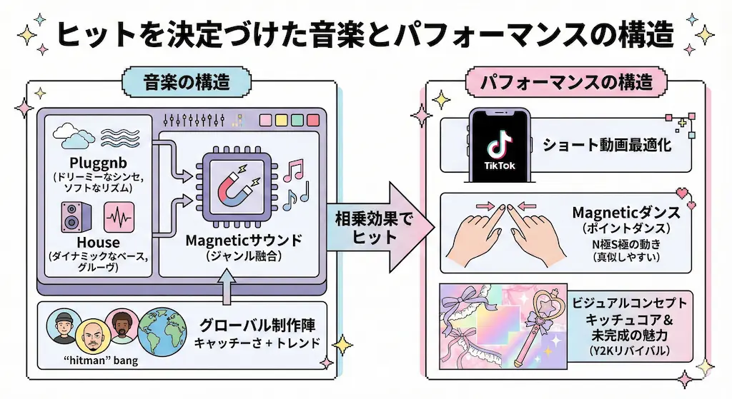 『Magnetic』が記録的ヒットとなった最大の要因は、その中毒性の高い音楽とパフォーマンスにあります。ここでは、その構造的な秘密を紐解いていきます。