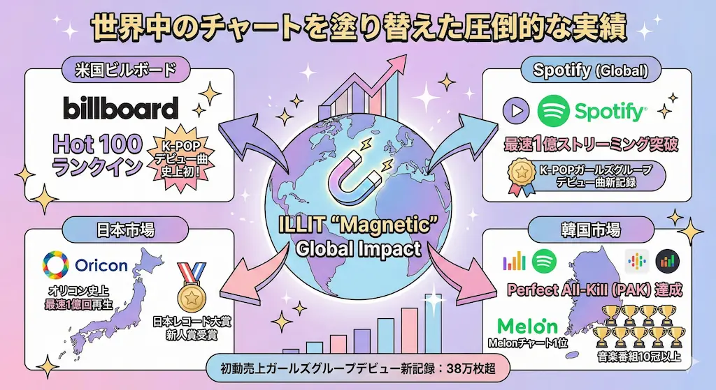 戦略的な楽曲制作とプロモーションは、驚くべき数字となって表れました。ここでは、ILLITが打ち立てた記録の数々を紹介します。