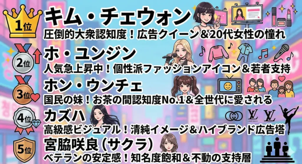 韓国国内での実質的な人気ナンバーワンは、間違いなくキム・チェウォンです。彼女は韓国企業評判研究所が発表するブランド評判指数において、グループ内で常に最上位をキープしており、大衆的な認知度が抜群に高いです。