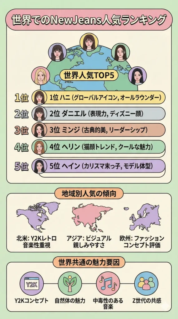 世界的に見ても、Hanniの人気は頭一つ抜けています。私が海外のK-POPフォーラムを分析すると、彼女のオールラウンダーとしての実力と、英語ネイティブであることによる親近感が強く支持されています。グローバルブランドのアンバサダーとしての知名度も抜群です。