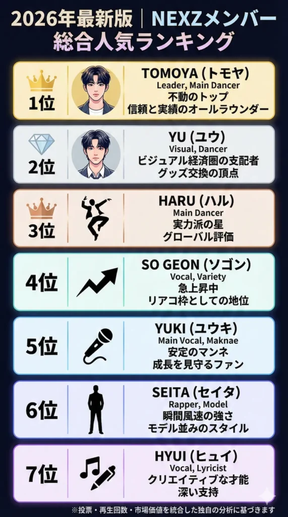 今回は2026年最新のNEXZメンバー人気順を、多角的な視点から解説しました。ランキングはあくまで一つの指標であり、メンバー全員がかけがえのない魅力を持っています。