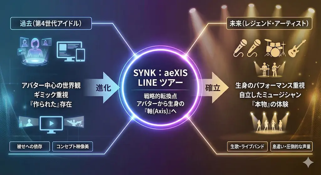 今回のツアータイトルにある「aeXIS(Axis=軸)」には、彼女たちのパフォーマンスこそがショーの中心であるという強い意志が込められています。前回の「SYNK:Hyper Line」や「SYNK:Parallel Line」がコンセプト重視だったのに対し、今回はライブバンドを従えた生のサウンドが際立っています。