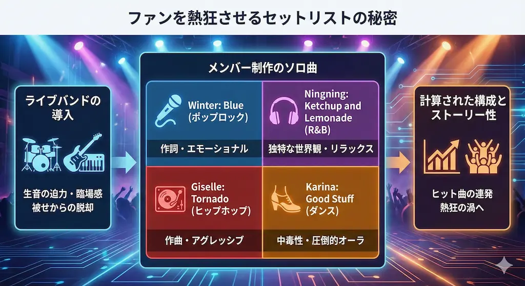私はこのバンドセットこそが、今回のツアーの最大の魅力だと確信しています。デジタルなサウンドが特徴だったaespaの楽曲に、ドラムやギターの生音が加わることで、楽曲自体に新たな命が吹き込まれ、これまでとは全く異なるグルーヴが生まれているからです。