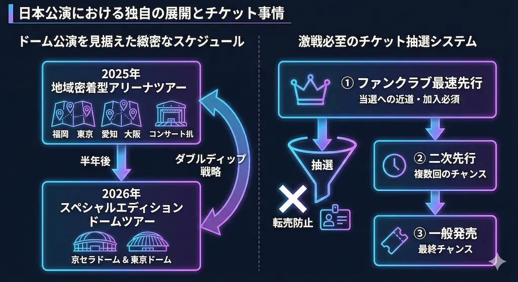 さらに2026年4月には、京セラドームと東京ドームでの「スペシャルエディション」公演が控えています。一度アリーナで公演を行った地域に、半年後にドーム規模で戻ってくるという「ダブルディップ(二度漬け)」戦略は、ファンの熱量を維持しつつ収益を最大化する非常に賢いやり方です。
